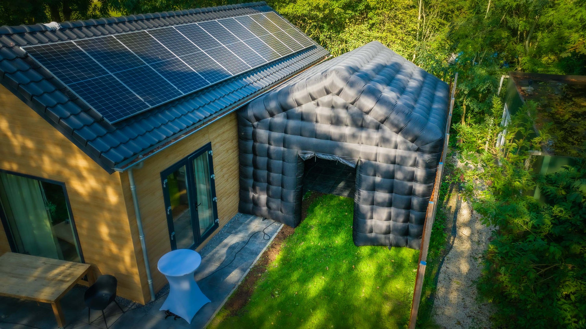De opblaasbare partytent is waterdicht en kan opgezet worden tot windkracht 5.